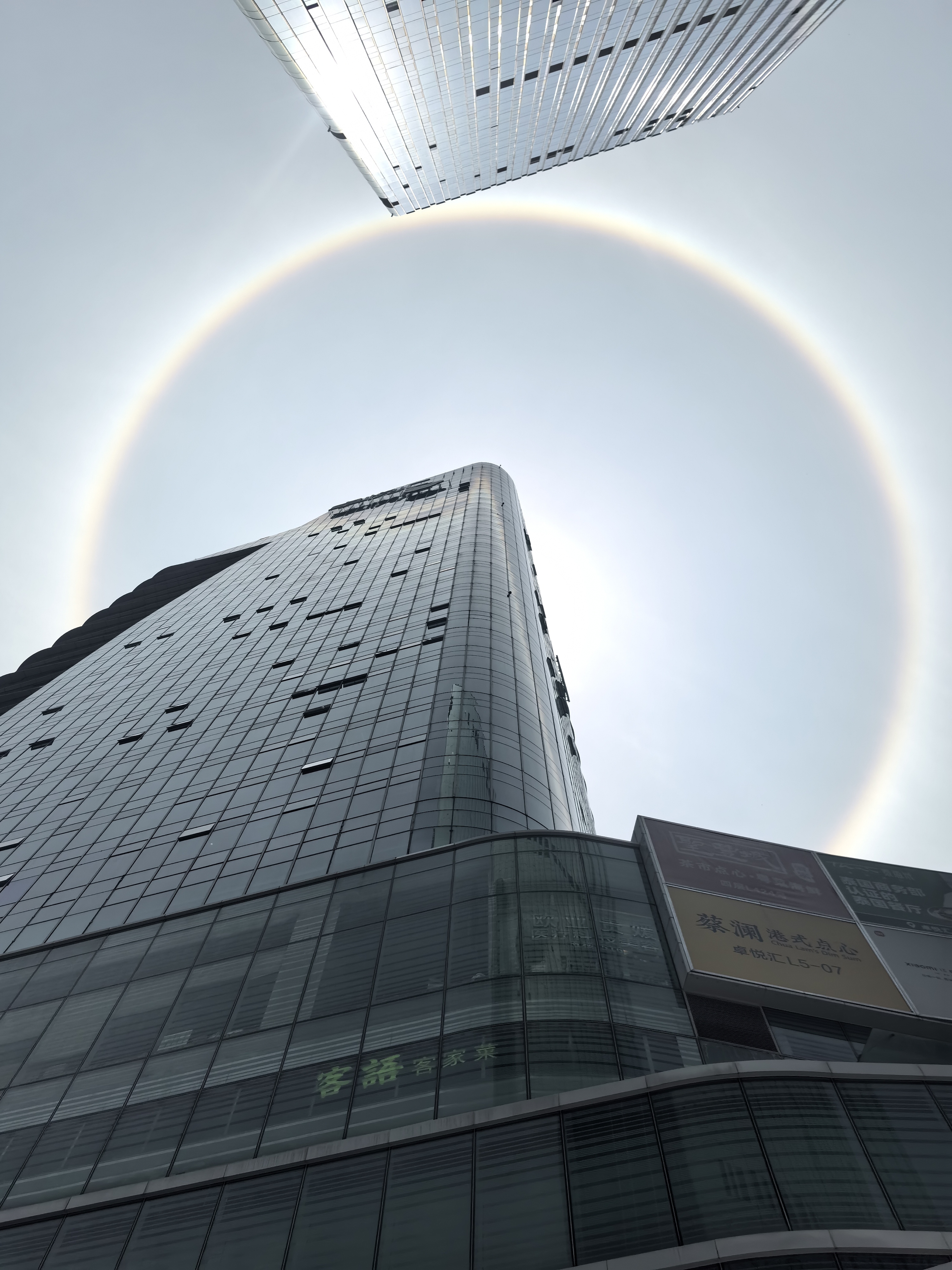 2024年4月10日(周三)中午,深圳上空出现日晕现象,肉眼清晰可见太阳周围有一个巨大彩色光环。